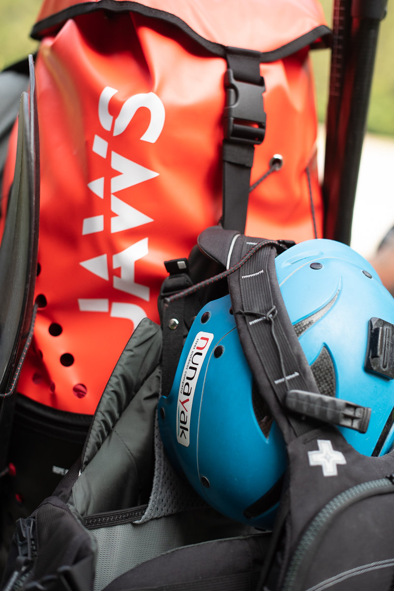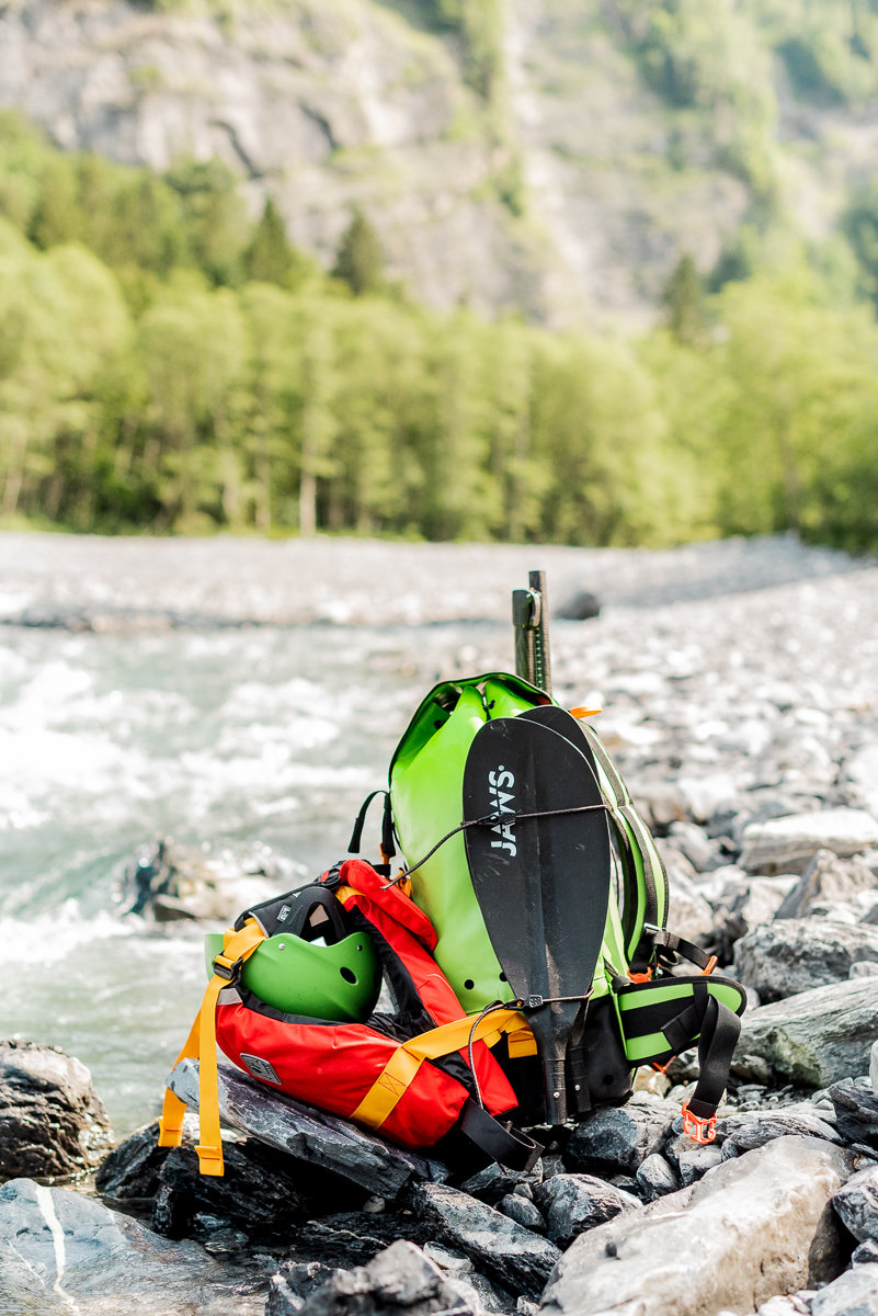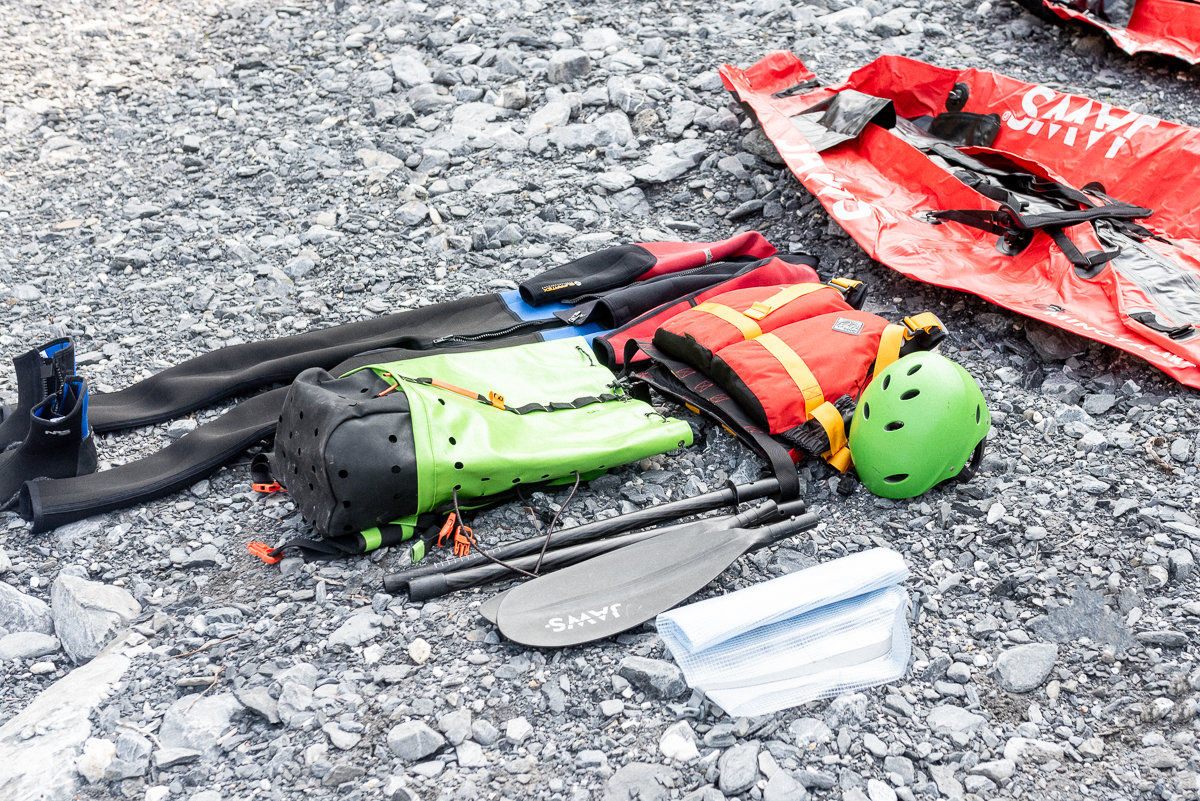 In the Packraft rucksack: the boat and its paddle, a waterproof bag for your hiking gear, and your water sports equipment (helmet, wetsuit and boots, lifejacket).