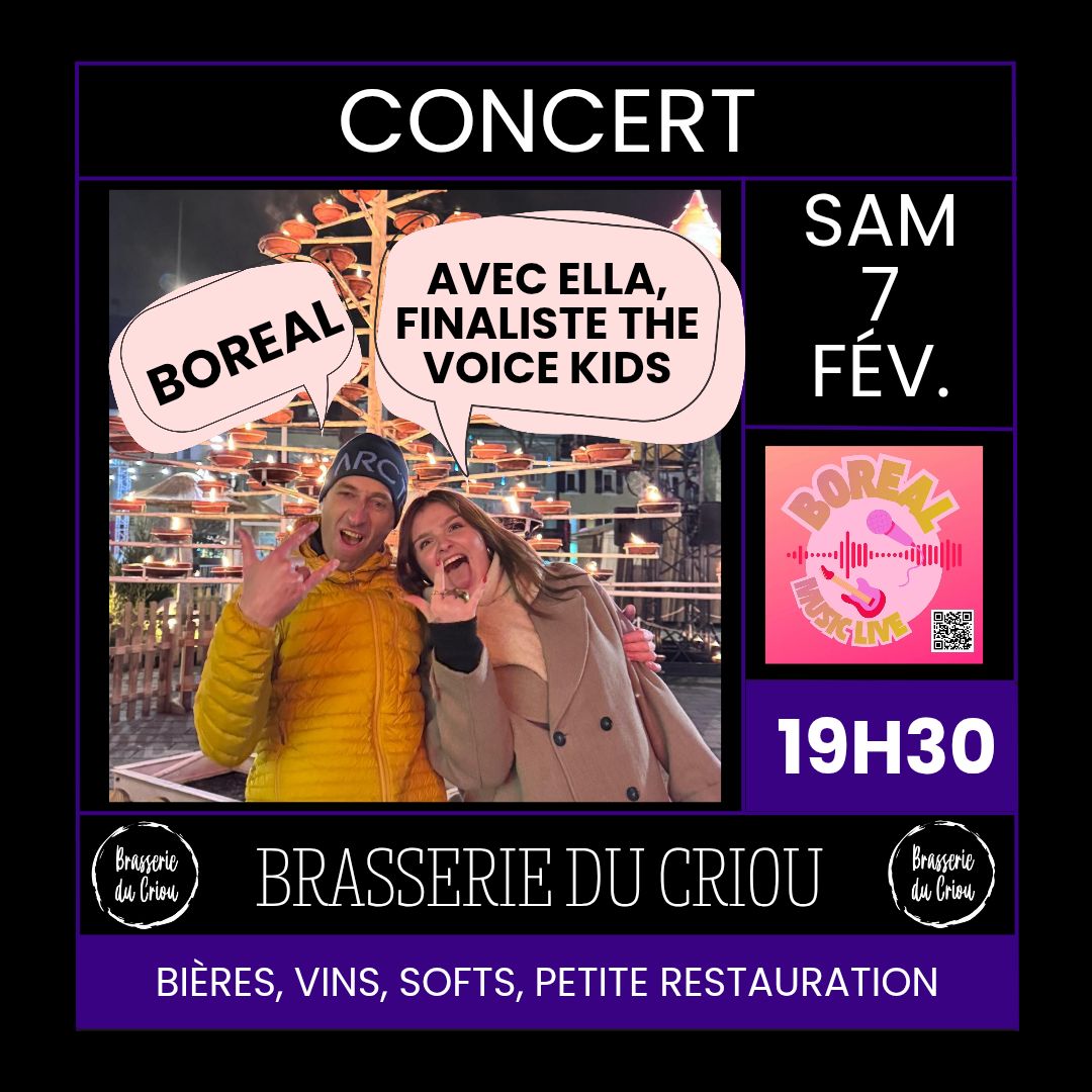 The bar of Brasserie du Criou welcomes the group Boréal, a duo made up of Sylvain and Ella, finalists of The Voice Kids. Between emotions, harmonies, and on-stage energy, Boréal promises you a unique musical experience in a friendly atmosphere.